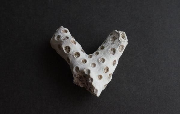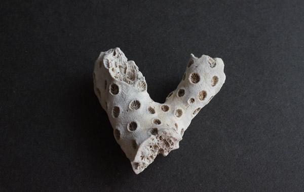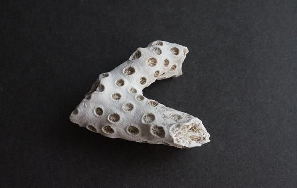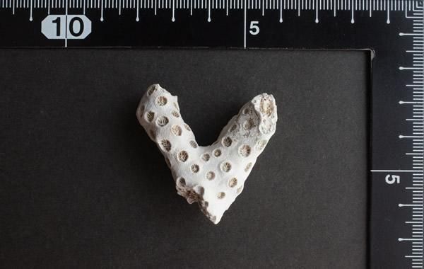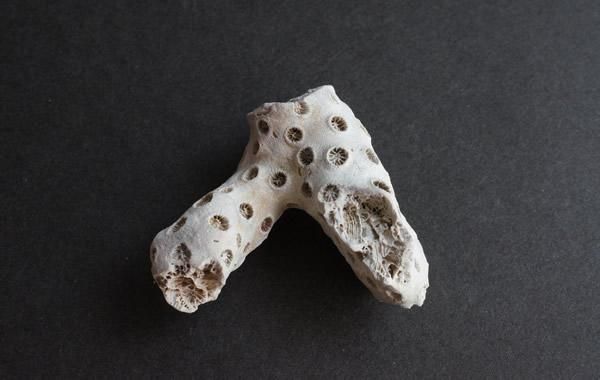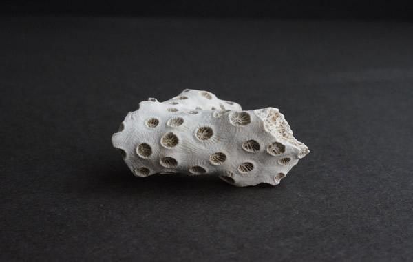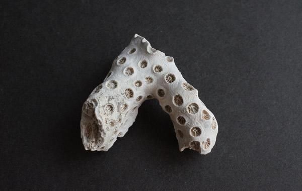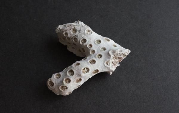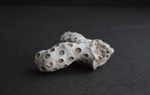 今から約1500万年前、中新世のアメリカ産サンゴ(サンゴ虫類)の化石です。表面の無数にある穴の中にはサンゴらしい模様が広がっています。