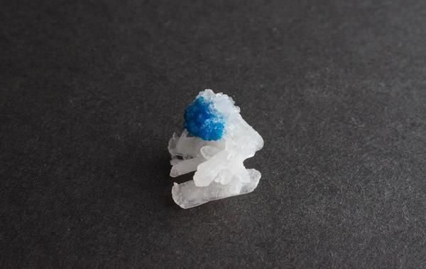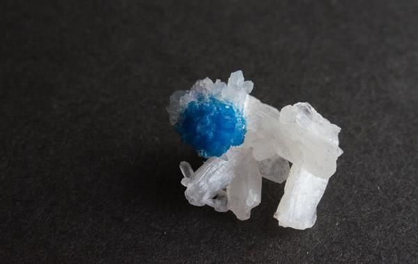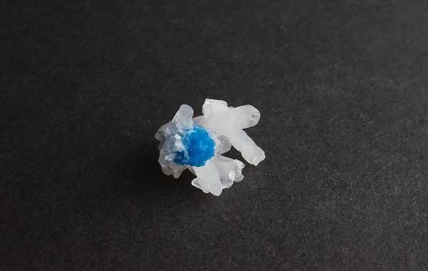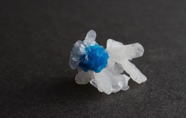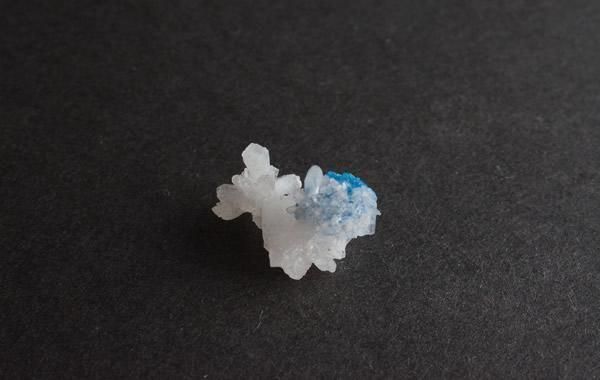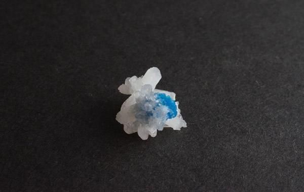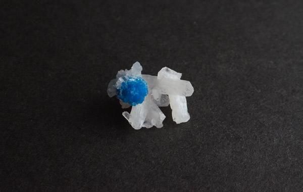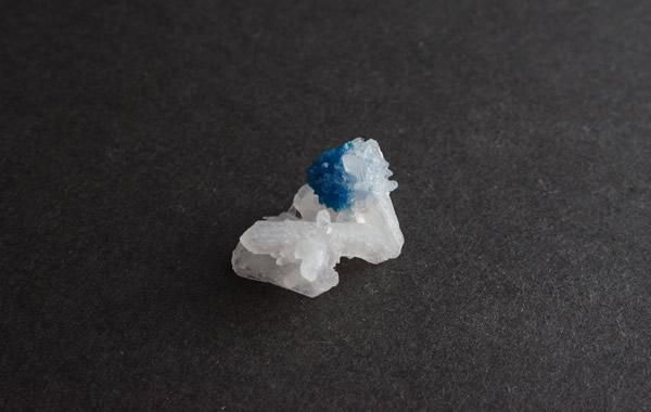 鮮やかな青色のカバンサイト、白い板状の結晶が重なりあうスティルバイト、小さく繊細な共存です。
