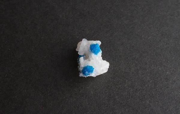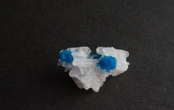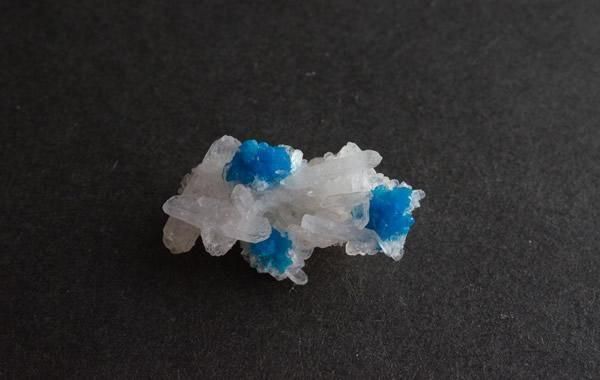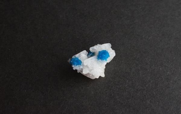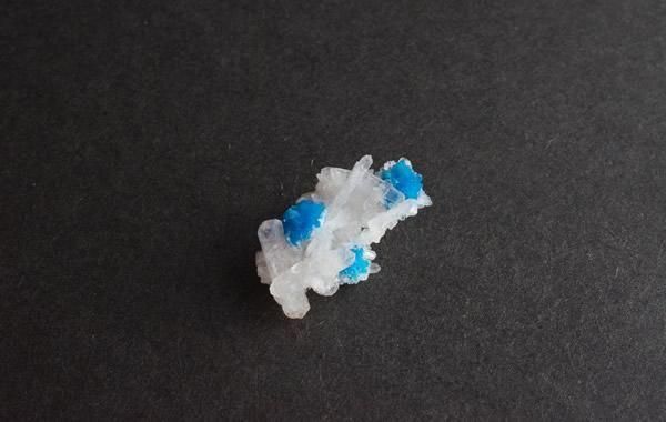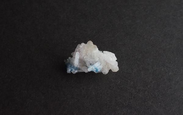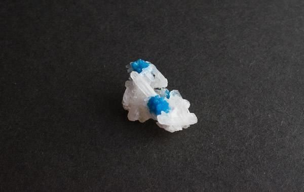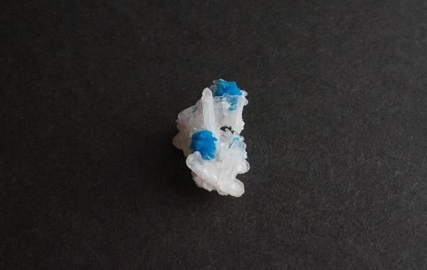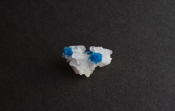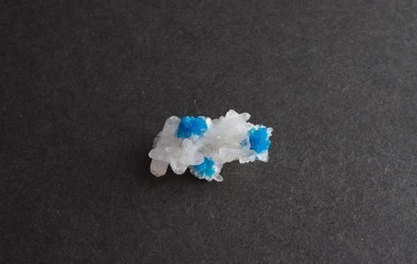 鮮やかな青色のカバンサイト、白い板状の結晶が重なりあうスティルバイト、小さく繊細な共存です。